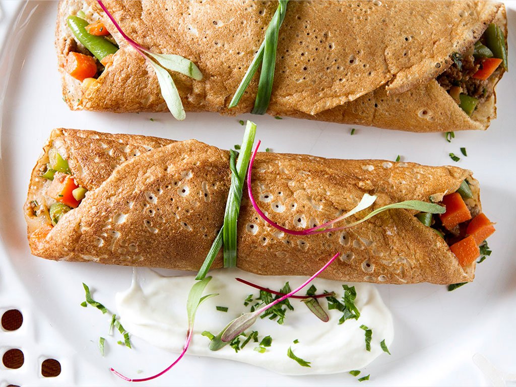 Massas, como a panqueca, devem ficar fora do cardápio? Nada disso! Confira a minha versão, que usa ingredientes integrais e recheio à base de carne e legumes. Com vídeo.