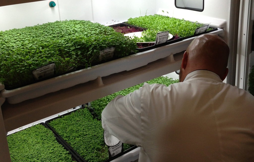 São ervas aromáticas e vegetais (como coentro, amaranto, rabanete, brotos de girassol, feijão e bambu – e também as versões mini de repolho e alface).